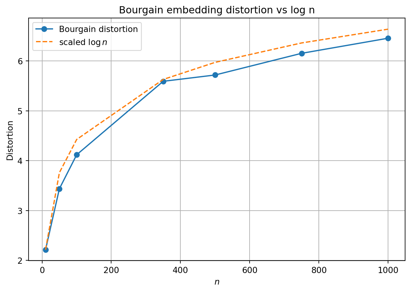 Metric embeddings and dimension reduction are important tools in computer science and mathematics for solving the curse of dimensionality. In this post, I want to examine the Bourgain embedding, which shows that any finite metric space can be embedded into an Euclidean metric space space with \(O(\log n)\) distortion. While Bourgain embeddings are very impractical (the constant factors in the big - O are huge and the “reduced” dimensions is still high), it is an important result that shows us that no matter how “horrible” the initial metric space is, we can be achieve a distortion factor of \(O(\log n)\).