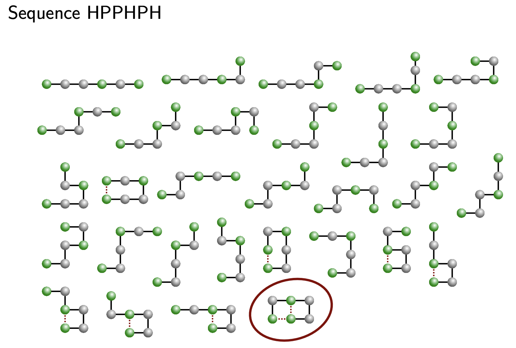 Below is an example sequence \(HPPHPH\) and possible folded configurations \(\omega\). \(H\) amino acids are colored green and \(P\) amino acids are in silver. The configuration \(\omega\) that has the minimum energy of all the listed configurations is circled in red, since it has three \(HH\) contacts, most out of the others. Image courtesy of MIT: 18.417